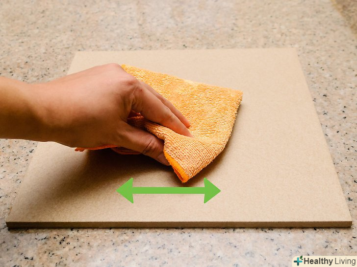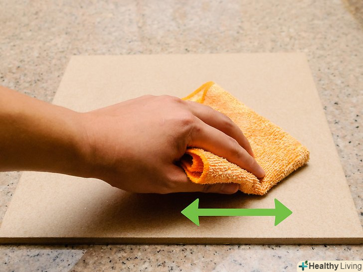 Протріть поверхню за допомогою вологої тканини.після протирання потрібно нанести шар суміші соди на поверхню плити. Нанесіть її за допомогою вологої тканини, коли відчуєте, що звичайне ополіскування вже не дає належного результату.- Повторно пройдіться по проблемних ділянках каменю після очищення, якщо ви не задоволені його зовнішнім виглядом. Повторюйте процес, поки проблемна зона не стане світліше або не зникне повністю.