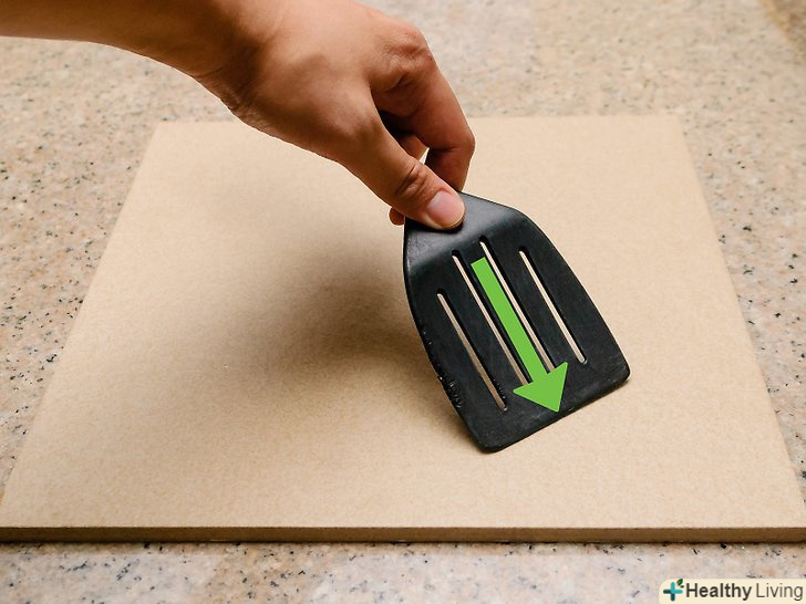 При необхідності протирайте камінь для піци вологою тканиною.намочіть мочалку в теплій воді і протріть камінь. Видаліть всі частинки їжі, які можна прибрати без застосування скребка.- В крайньому випадку, необхідно замочити камінь у воді.запечені або підгорілі залишки їжі, можливо, потребують замочування, що полегшить процес подальшого видалення. Замочіть камінь для піци в чистій воді на ніч і знову спробуйте очистити. Майте на увазі, що при цьому камінь вбере велику кількість вологи, тому дайте йому час повністю висохнути протягом тижня або близько того. Після цього в ньому все одно залишиться велика кількість вологи, навіть якщо камінь виглядає абсолютно сухим.