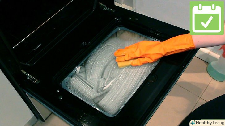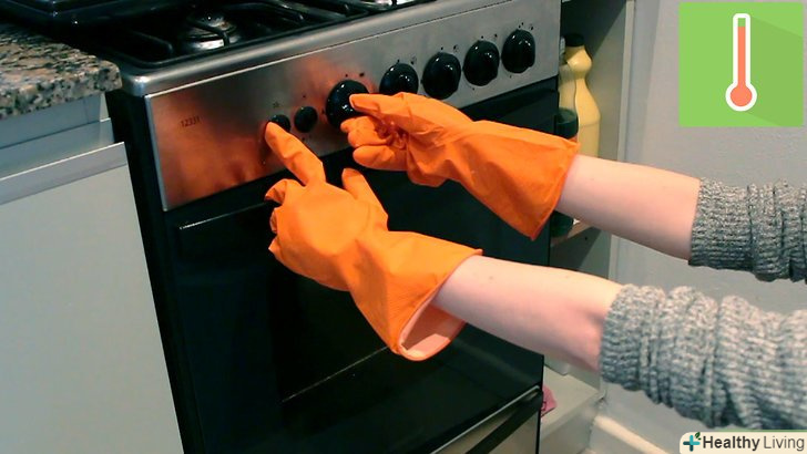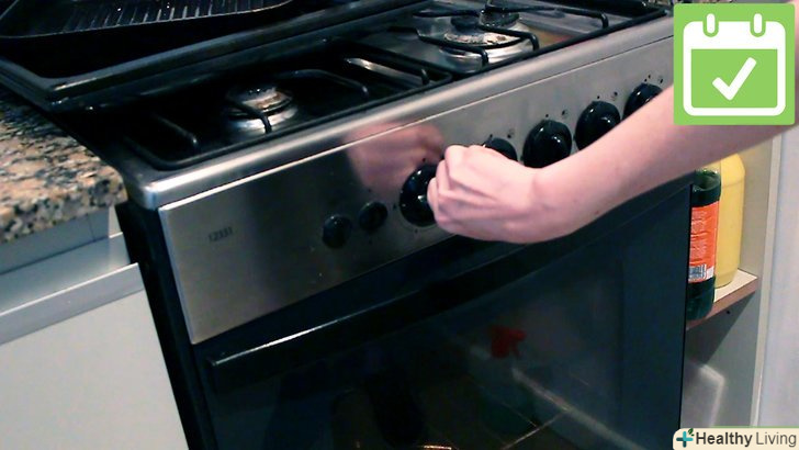 Розігрійте духовку до 40-50 °C. щоб видалити стійкі плями, вам доведеться трохи розігріти духовку (приблизно до 40-50 °C). Як тільки необхідна температура в духовці буде досягнута, вимкніть її, відкрийте дверцята і залиште її на хвилинку трохи охолонути. Ви зрозумієте, що дверцята придбала потрібну температуру, коли вона стане теплою, а не гарячою на дотик.[4]- Не нагрівайте духовку вище 50 °C. Якщо духовка перепечеться, ви можете випадково обпектися.