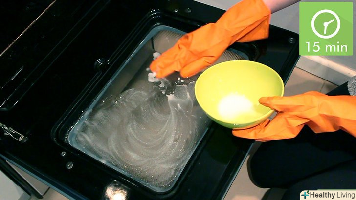 Приготуйте пасту з харчової соди.змішайте в неглибокій мисці три частини харчової соди і одну частину води до повного розчинення соди. Склад придбає текстуру не дуже густої пасти. Відкрийте духовку і змастіть цією пастою внутрішню сторону скла дверцят. Можна прямо пальцями якісно обробити абсолютно всю площу скла.[1]