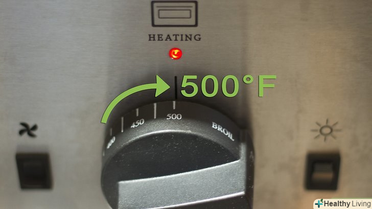Поставте сковороду в духовку, розігріту до 260 °С, на 1 годину.Розігрійте духовку до граничної температури і постеліть лист фольги на нижню решітку. Поставте сковороду догори дном на найвищу решітку і залиште на 1 годину. За цей час масло скріпиться з чавуном, і тим самим сформується протипригарний шар.[12]- Зайве масло буде капати вниз на фольгу під час прожарювання сковороди. Завдяки цьому вам не доведеться чистити духовку!