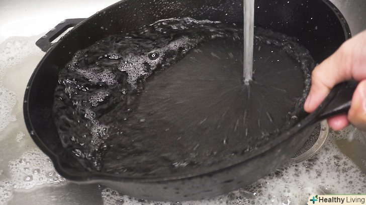 Помийте сковороду в теплій воді засобом для миття посуду.змийте бруд зі сковороди ганчіркою, тримаючи її під струменем теплої води. Робіть це поки вода, що стікає зі сковороди, не стане прозорою. Потім сполосніть сковороду, щоб повністю змити пил і частинки, що залишилися від металевої мочалки.[9]- Висушіть сковороду в розігрітій духовці.розігрійте духовку до 180 °С.перш ніж ставити сковороду в духовку, візьміть чисту суху ганчірку і витріть з поверхні сковороди залишилася вологу. Через 10 хвилин дістаньте сковороду з духовки і поставте на товсте кухонний рушник, щоб не пошкодити робочу поверхню.[10]
