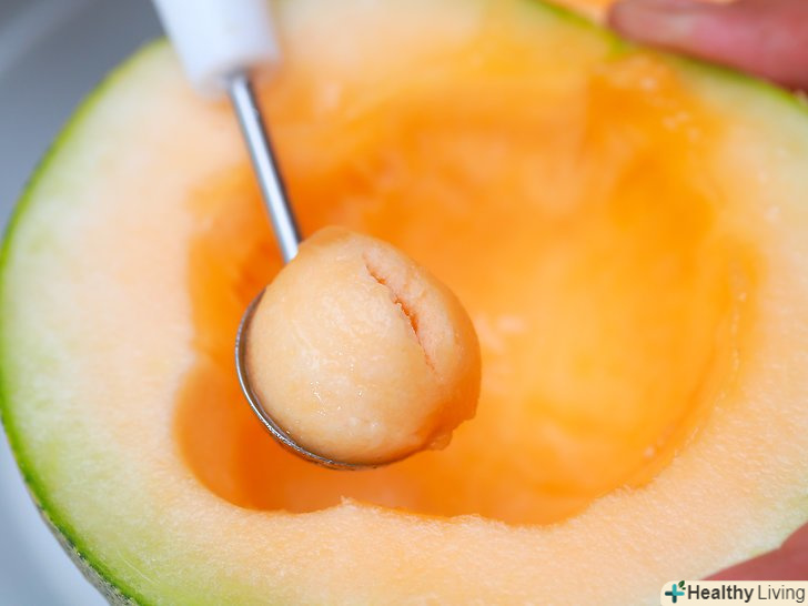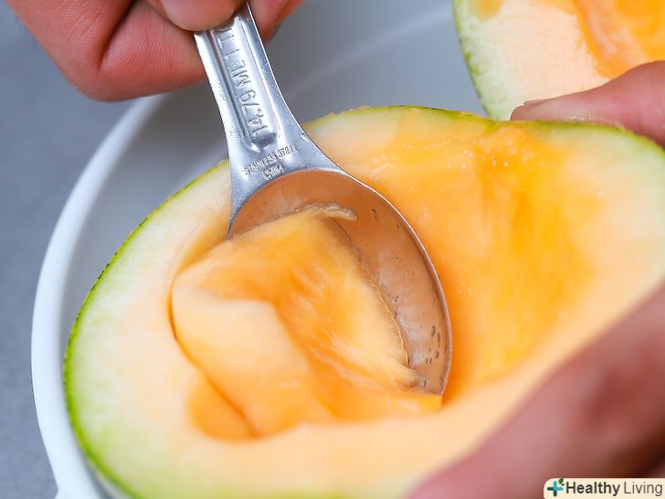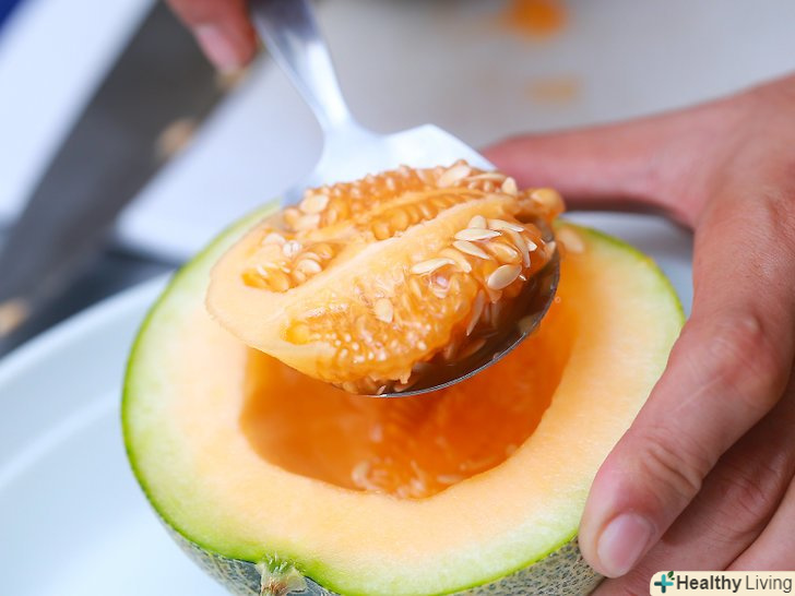 Розріжте диню навпіл і видаліть насіння.сік не витече, якщо ви розріжете диню навпіл. Однак це не має особливого значення, коли ви будете різати її на четвертинки або часточки. Якщо в центрі дині дуже багато насіння, вийміть їх за допомогою великої ложки і викиньте.
