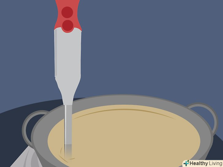 Вставте блендер в суміш.на цьому етапі необхідно переконатися в тому, що насадка блендера повністю занурена. Якщо не дотримуватися цього правила, ви забризкати їжею всю кухню.[5]