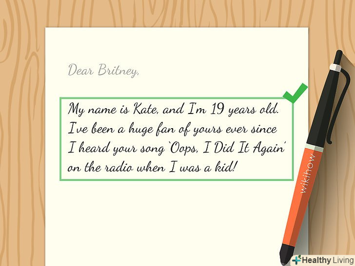 Пишіть коротко і по справі.проявіть повагу до знаменитості, написавши лист довжиною приблизно в сторінку. Оскільки зірки-люди зайняті і, ймовірно, отримують багато листів від шанувальників, одна сторінка — це ідеальна довжина листа для швидкого прочитання.[1] Пишіть коротко і по справі.проявіть повагу до знаменитості, написавши лист довжиною приблизно в сторінку. Оскільки зірки-люди зайняті і, ймовірно, отримують багато листів від шанувальників, одна сторінка — це ідеальна довжина листа для швидкого прочитання.[1]- Майте на увазі, що якщо ви напишете більш великий лист, малоймовірно, що знаменитість буде читати далі першої сторінки.