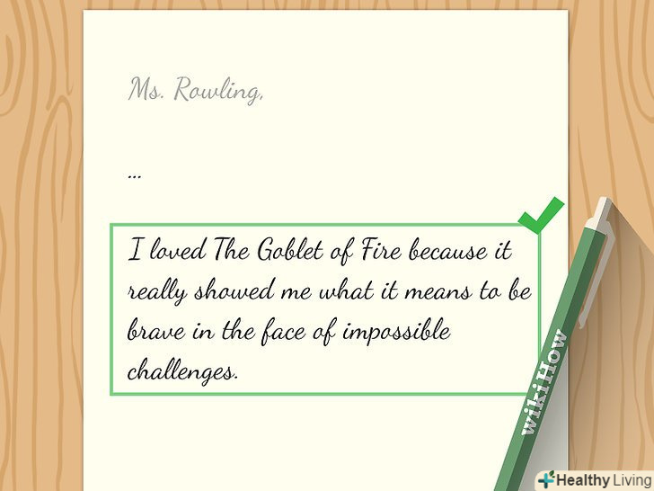 Згадайте свою улюблену книгу, фільм або виступ у його виконанні.Будьте максимально конкретні при написанні свого листа. Скажіть, чому саме ця книга, передача або цей фільм подобається вам найбільше, і згадайте свою улюблену фразу або сцену. Розкажіть про те, як це вплинуло на формування вашої особистості.[3] Згадайте свою улюблену книгу, фільм або виступ у його виконанні.Будьте максимально конкретні при написанні свого листа. Скажіть, чому саме ця книга, передача або цей фільм подобається вам найбільше, і згадайте свою улюблену фразу або сцену. Розкажіть про те, як це вплинуло на формування вашої особистості.[3]- Це допоможе встановити зв'язок зі знаменитістю і, можливо, підвищить шанси отримати відповідь.