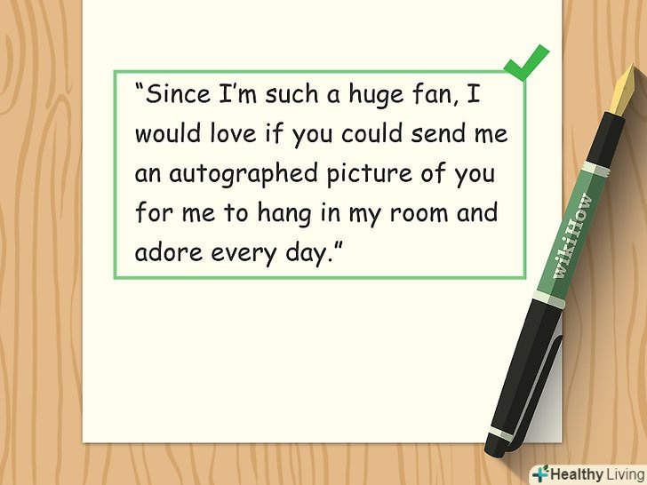 Якщо ви надсилаєте лист, ввічливо попросіть автограф.якщо ви пишете для того, щоб отримати автограф, не бійтеся його попросити! Просто дотримуйтесь правил хорошого тону, написавши що-небудь таке: «якби ви змогли відправити мені автограф, це б означало для мене дуже багато». [4] Якщо ви надсилаєте лист, ввічливо попросіть автограф.якщо ви пишете для того, щоб отримати автограф, не бійтеся його попросити! Просто дотримуйтесь правил хорошого тону, написавши що-небудь таке: «якби ви змогли відправити мені автограф, це б означало для мене дуже багато». [4]- Майте на увазі, що немає гарантії, що Ви отримаєте хоч якусь відповідь від знаменитості, проте немає нічого поганого в тому, щоб попросити.