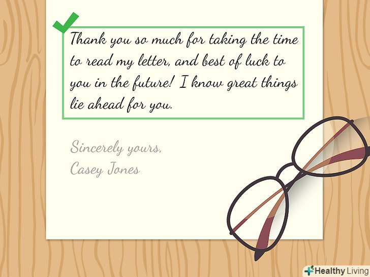 Подякуйте знаменитість і побажайте їй успіхів.важливо проявити дружелюбність у своєму листі і висловити радість від того, що Ви отримали можливість зв'язатися з цією людиною. Скажіть «» велике спасиБі, що приділили час на прочитання мого листа", — або: "бажаю вам успіхів у наступному проекті!"Ви навіть можете задати наводить на роздуми питання, щоб спонукати кумира до відповіді![5] Подякуйте знаменитість і побажайте їй успіхів.важливо проявити дружелюбність у своєму листі і висловити радість від того, що Ви отримали можливість зв'язатися з цією людиною. Скажіть «» велике спасиБі, що приділили час на прочитання мого листа", — або: "бажаю вам успіхів у наступному проекті!"Ви навіть можете задати наводить на роздуми питання, щоб спонукати кумира до відповіді![5]- Таким чином ви покажете людині, що ви не просто хочете отримати автограф, але і те, що він вам дійсно небайдужий.