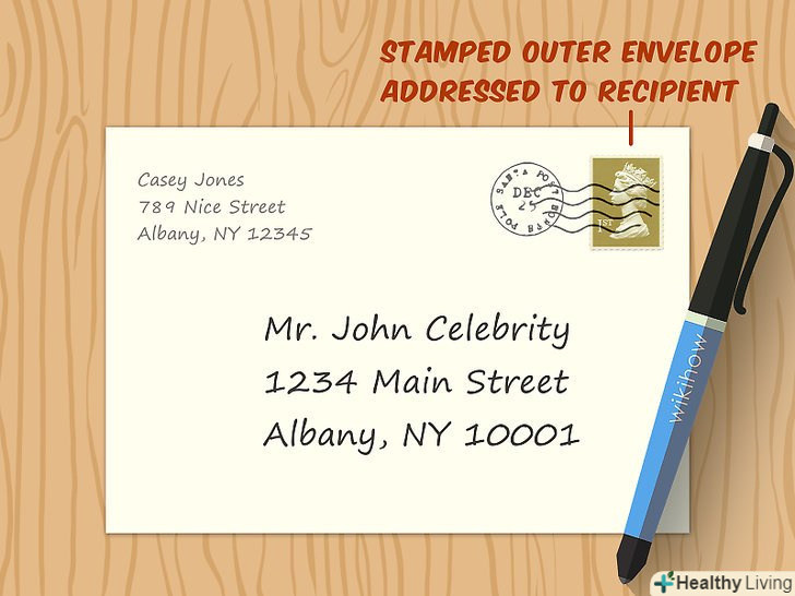 Прикладіть лист і конверт зі своєю адресою і маркою, якщо хочете отримати відповідь.складіть лист і помістіть його в конверт. Якщо ви відправляєте лист з проханням про автограф, додайте ще один конверт, підписавши на ньому свою адресу, і наклейте на нього марку. Вкладіть цей конверт в основний конверт з листом. Таким чином, все, що знаменитості потрібно буде зробити, - це поставити автограф, покласти його в конверт і відправити назад вам![7] Прикладіть лист і конверт зі своєю адресою і маркою, якщо хочете отримати відповідь.складіть лист і помістіть його в конверт. Якщо ви відправляєте лист з проханням про автограф, додайте ще один конверт, підписавши на ньому свою адресу, і наклейте на нього марку. Вкладіть цей конверт в основний конверт з листом. Таким чином, все, що знаменитості потрібно буде зробити, - це поставити автограф, покласти його в конверт і відправити назад вам![7]- Переконайтеся, що конверт досить великий-в нього має вміститися те, що ви просите, наприклад, підписане зображення. При необхідності складіть конверт з попередньо написаним адресою перш, ніж помістити його в конверт з листом.