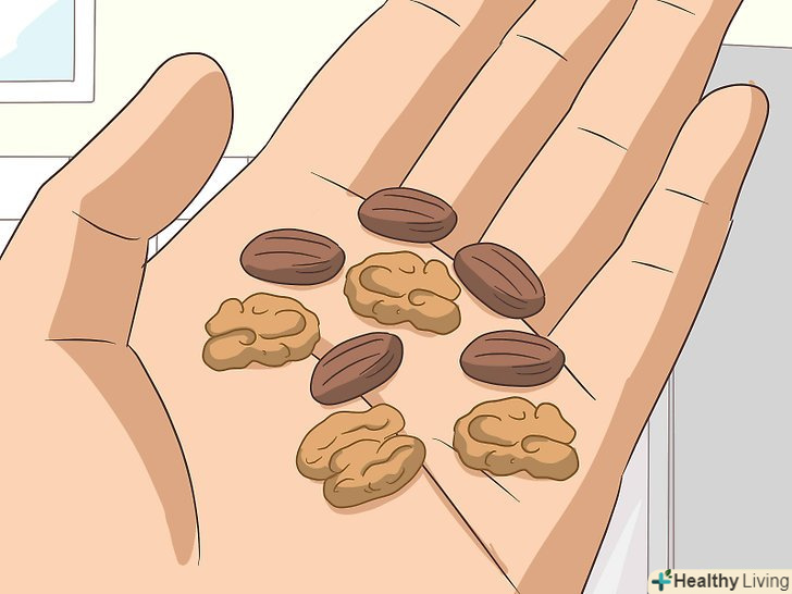 Перекушуйте горіхами і насінням.жменя горіхів і насіння стане хорошим перекусом протягом дня, а також відмінним способом включити більше здорових жирів в свій раціон, якщо ви скорочуєте кількість споживаного м'яса.[13] певні види горіхів, наприклад каштани, насіння гарбуза і кешью, особливо добре ощелачивают організм.- Мигдаль, кунжут і насіння соняшнику також підвищують pH сечі, хоча і не так добре, як інші.[14]