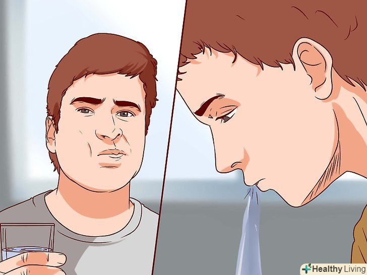 Полоскайте горло. наберіть в рот теплої води, відкиньте голову назад і гарненько прополощіть горло. Симптоми значно зменшаться. Якщо ви хочете швидко позбутися від неприємних симптомів, полоскайте горло якомога частіше. Робіть це протягом декількох хвилин. [12] [13]- Приготуйте розчин для полоскання горла. Розчиніть ½ чайної ложки солі в склянці теплої води. Таке полоскання сприяє виробленню слини, загоєнню слизової і зменшення симптомів.
