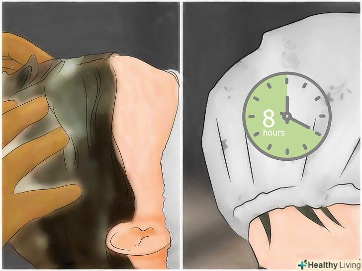 Нанесіть достатню кількість засобу на волосся людини. подбайте про те, щоб засіб було нанесено на всю шкіру голови і по всій довжині волосся. Одягніть шапочку для душу на волосся. Вона повинна щільно облягати голову і людині повинно бути комфортно в ній. Не знімайте шапочку протягом восьми годин.