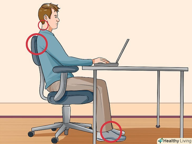 Дізнайтеся, як правильно сидіти за комп'ютером. Ноги повинні торкатися підлоги, спина повинна бути прямою, а шия повинна знаходитися в нейтральному положенні. Це допоможе зменшити біль у спині, а також випрямити спину. Також ви можете купити ергономічні крісла, які сприяють тому, щоб ви сиділи прямо і вам було зручно. [16]
