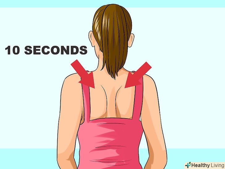 Виконуйте інші вправи і розтяжки, щоб поліпшити поставу. вибираючи відповідну техніку, зосередьтеся на м'язах живота і спини, оскільки саме вони підтримують хребет. [12]- Стисніть лопатки разом. Уявіть, що ви тримаєте між лопатками кульку. Спробуйте стиснути кульку, зводячи лопатки разом. Затримайтеся в такому положенні на 10 секунд. Це допоможе розтягнути передню частину плечей, яка, ймовірно, буде напружена через погану поставу.