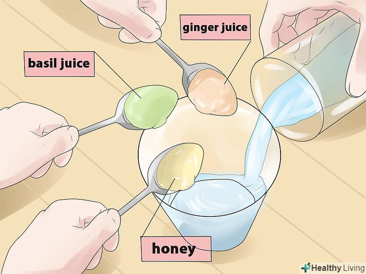 Приготуйте напій з базиліка і імбиру. у чашку теплої води додайте одну ложку соку базиліка, одну ложку соку імбиру і одну ложку меду. Змішайте всі інгредієнти і давайте дитині приготований напій чотири рази на день. Сік допоможе заспокоїти біль у горлі дитини і послабити нудоту, яку він може відчувати.