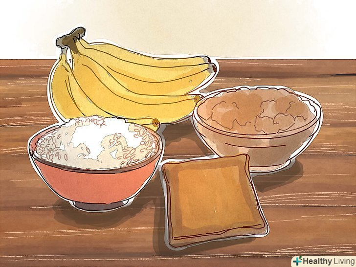 Утримайтеся від прийомів їжі, якщо у вас блювота або пронос. зачекайте деякий час, поки у вас не припиниться блювота або пронос, перш ніж переходити на тверду їжу. Якщо блювота у дитини, давайте йому тверду їжу тільки через 6 годин після її припинення. [1] додайте м'які продукти в свій раціон на наступний день після того, як у вас припиниться діарея.- Якщо ви відчуваєте нудоту, спробуйте вводити в свій раціон спочатку рідкі продукти, а пізніше додавайте тверді. Спочатку ви можете з'їсти курячий бульйон без нічого, а потім перейти на курячий суп з локшиною або смузі. Далі вводите м'які продукти, такі як картопляне пюре, а потім переходите на звичне для вас меню.