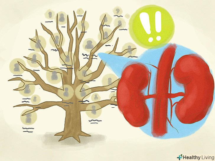 Дізнайтеся у батьків, чи були у ваших близьких проблеми з нирками. дуже часто зустрічаються спадкові захворювання нирок, тому, якщо у вашому сімейному анамнезі є захворювання нирок, ризик значно збільшується. [16] якщо батьки підтвердять цей неприємний факт, Ви можете поговорити з лікарем про профілактичні заходи, які допоможуть вам стежити за здоров'ям нирок.