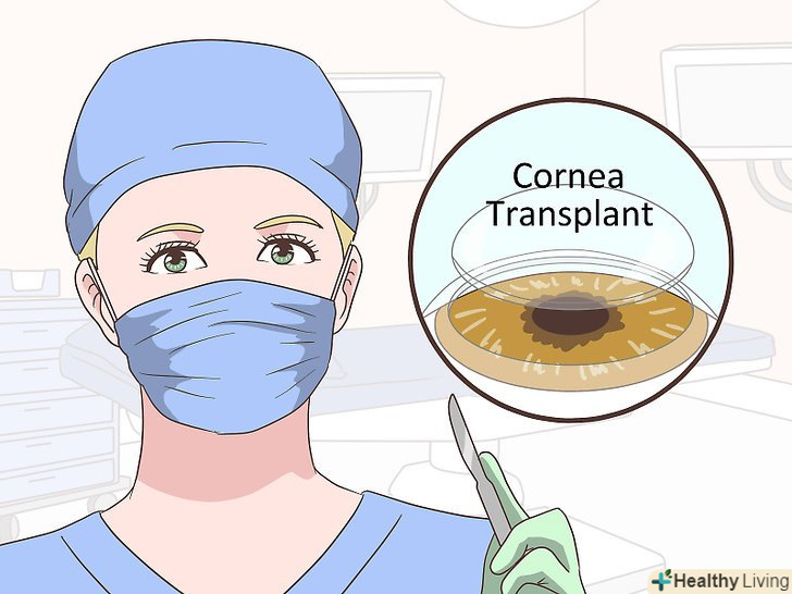Дізнайтеся у лікаря про пересадку рогівки. тільки найрідкісніші, запущені і важкі випадки кератоконуса потребують пересадки рогівки. Пересадку зазвичай призначають тільки в тому випадку, якщо інші методи лікування не допомогли. Лікар пояснить вам, як підготуватися до процедури і розповість про післяопераційний догляд. [12]- Додому можна буде повернутися вже в день операції, але потрібно, щоб вас хтось відвіз. Час на відновлення буде залежати від тяжкості захворювання і може зайняти від 6 до 12 місяців. [13]