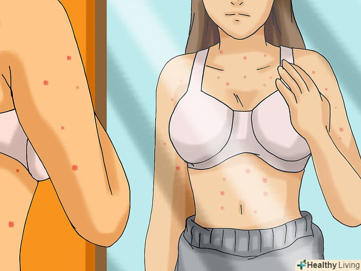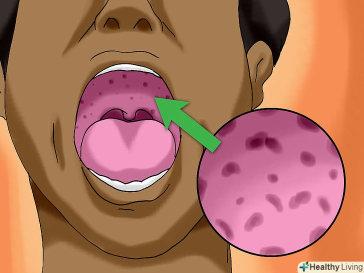 Перевірте, чи немає у вас висипу на верхньому небі.у деяких людей мононуклеоз супроводжується дрібною червоною висипкою на верхньому небі. Широко відкрийте рот і огляньте верхнє небо за допомогою дзеркала. Дрібні червоні плями можуть свідчити про мононуклеозі.[8]- У деяких випадках мононуклеоз може супроводжуватися також шкірним висипом.