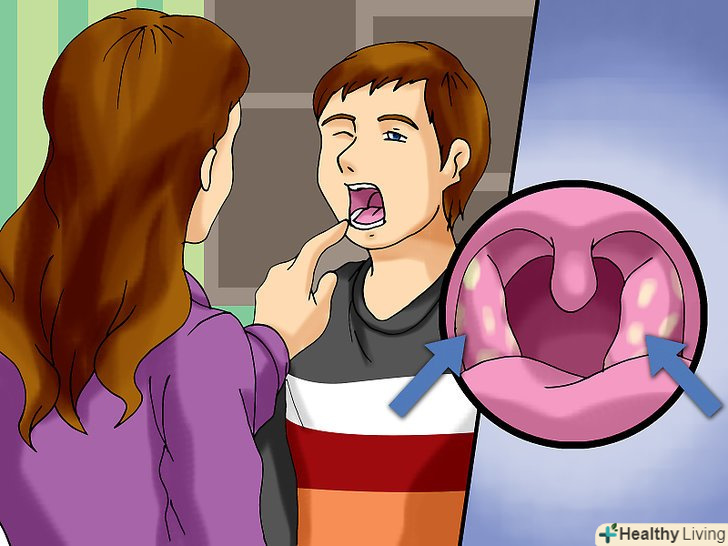 Перевірте, чи немає на мигдалинах білих плям.мигдалини являють собою залози, які розташовані в нижній частині рота по обидві сторони горла. При бактеріальному тонзиліті на мигдалинах можуть з'явитися дрібні білі наповнені гноєм плями.[11] Встаньте перед дзеркалом, широко відкрийте рот і уважно огляньте тканини з боків задньої стінки горла. Якщо вам складно зробити це самостійно, попросіть члена сім'ї оглянути ваше горло і спробуйте при цьому посвітити ліхтариком.- Мигдалини можуть бути червоними і набряклими як при бактеріальному, так і вірусному тонзиліті, хоча білі наповнені гноєм плями характерні для бактеріальної інфекції.