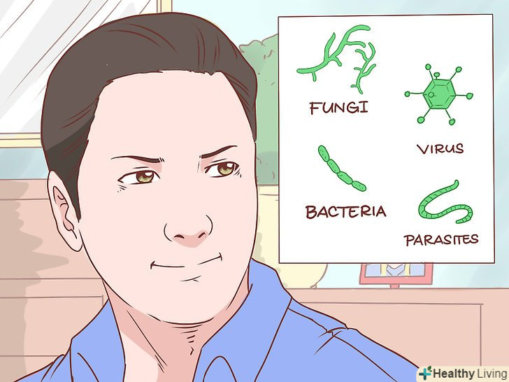 Різні види інфекційних захворювань. Пам'ятайте, що різні захворювання можуть бути викликані різними агентами. Це допоможе вам знати фактори ризику та уникати їх. [13]- Найбільш поширеними інфекційними агентами є бактерії. Зазвичай вони потрапляють в організм через рідини і їжу. Бактерії-це одноклітинні організми, що використовують організм людини в якості будинку і місця для розмноження.
