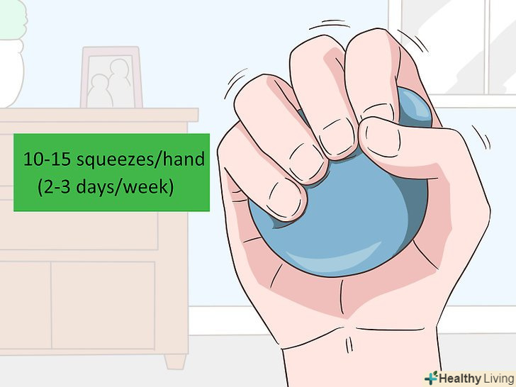 Зміцніть м'язи рук і передпліч. виконуйте силові вправи 2-3 дні в тиждень. Силу руки дуже просто зміцнити, стискаючи невеликий м'ячик, наприклад, м'ячик для зняття стресу. Стисніть м'ячик 10-15 разів, а потім повторіть іншою рукою. [16]- Силу рук також можна зміцнити, займаючись тими видами спорту, де необхідно кидати і ловити м'яч. Кидайте м'яч з другом, грайте в баскетбол або кидайте тенісний м'яч в стіну і ловіть його.