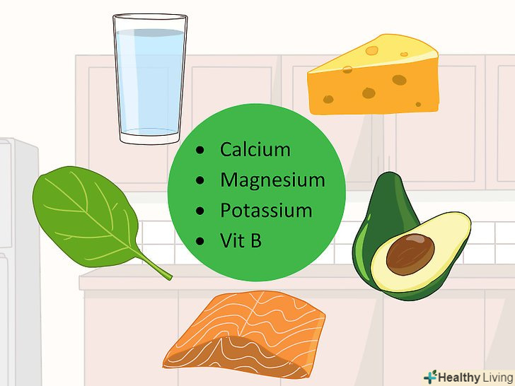 Постачайте організм водою і поживними речовинами. дотримуйтесь поживну і збалансовану дієту, отримуючи достатньо кальцію, магнію, калію і вітаміну В.випивайте не менше 8 склянок (2 літри) води в день. Якщо ви багато тренуєтеся або працюєте в сильній спеці, збільште кількість випивається рідини. [18]- З дозволу лікаря почніть приймати харчові добавки, щоб збільшити кількість одержуваних поживних речовин.