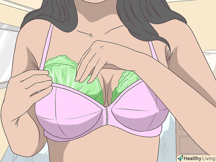 Підкладіть лист капусти в бюстгальтер.холодні листя зеленої капусти допомагають заспокоїти налиту груди. Візьміть качан капусти і відірвіть один з листя. Потім покладіть цей лист в бюстгальтер так, щоб він прилягав до грудей з усіх боків. Залиште лист до тих пір, поки він холодний. Повторюйте так часто, як це необхідно.[14]
