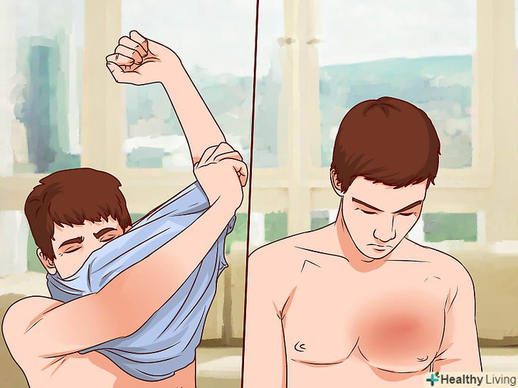 Перевірте, чи немає у вас синців. зніміть сорочку і майку і уважно огляньте груди і тулуб — можливо, ви виявите синці або почервонілі ділянки. Помірні і сильні розтягування м'язів супроводжуються частковим розривом м'язових волокон, що призводить до крововиливу в навколишні тканини. [5] в результаті утворюється темно-фіолетовий або червоний синець, який з часом світлішає і стає жовтуватим. Почервоніння на тулуб може також виникнути в результаті спортивної травми або падіння. У той же час при захворюваннях легенів синці зазвичай не спостерігаються, за винятком випадків проколу легенів зламаними ребрами.- Легкі розтягування м'язів зазвичай не супроводжуються синцями і почервонінням, хоча часто призводять до невеликого набряку.