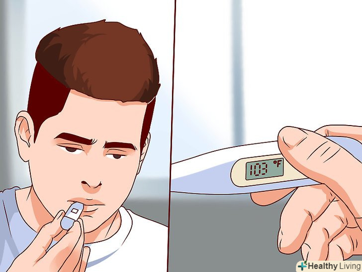 Виміряйте температуру тіла. багато поширені хвороби легенів викликаються патогенними організмами (бактеріями, вірусами, грибками та іншими паразитами) або оточуючими подразниками (азбестом, гострими волокнами, пилом, алергенами). Зважаючи на це вони часто супроводжуються не тільки болем в грудній клітці і кашлем, а й підвищеною температурою (жаром). У той же час розтягнення м'язів майже ніколи не впливає на загальну температуру тіла, якщо тільки воно не настільки серйозно, щоб викликати гіпервентиляцію. Тому виміряйте за допомогою цифрового термометра температуру під язиком. У нормальному стані температура в роті повинна бути близька до 36,8 °C. [6]- Легкий жар часто корисний, так як допомагає організму захиститися від інфекції.