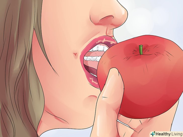 Їжте хрусткі продукти. їжа, яку потрібно розгризати (яблука, морква, редис), дозволить механічно видалити залишки їжі, що застрягла між зубів, і плями на емалі. [4]- Остерігайтеся в'язкої, липкої їжі, тому що частини такої їжі можуть прилипати до зубів і викликати потемніння емалі.