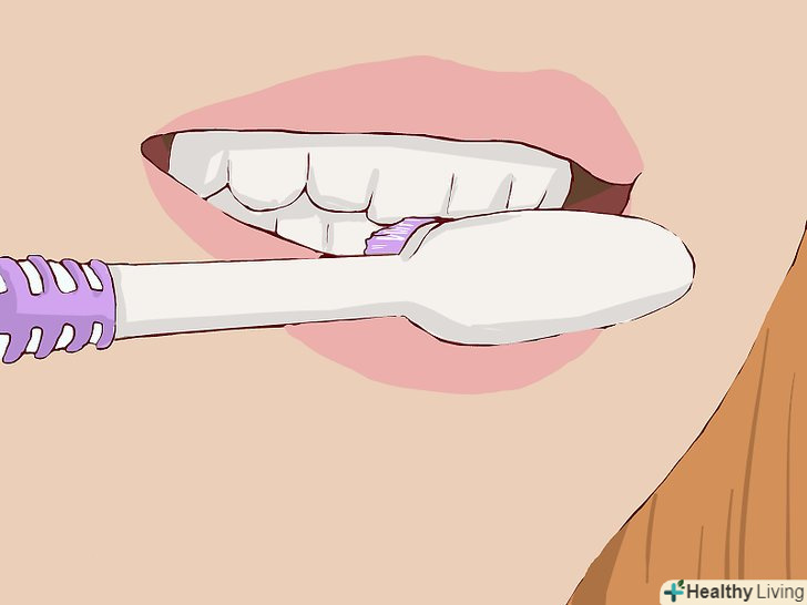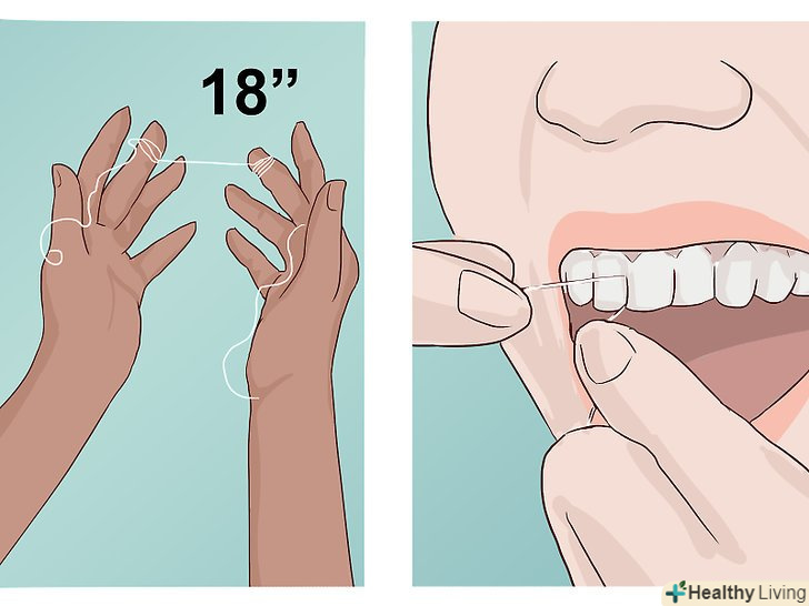 Кожен деньКористуйтеся зубною ниткою . щоденне використання флосса (зубної нитки) допомагає запобігти накопиченню зубної бляшки, яку не можна повністю вичистити однією лише зубною щіткою. Відріжте зубну нитку довжиною 20 см і намотайте кінці нитки на вказівні або середні пальці лівої і правої руки, щоб можна було двома руками натягнути відрізок нитки. Потім акуратно протягніть нитку в міжзубний проміжок і зубодесневую борозну (область, де поверхня зуба контактує з яснами), надаючи їй С-подібну форму. Будьте дуже обережні і ніколи не розміщуйте зубну нитку глибоко в ясна, а також не травмуйте ясна сильним тиском. [22]- Для видалення мікробної бляшки з усіх поверхонь зубів можна скористатися зубною ниткою, зубними йоржиками або спеціальними вже заготовленими флоссами, які представляють собою готову натягнуту на пластмасову ручку зубну нитку. Порадьтеся зі стоматологом, щоб зрозуміти, що вам найкраще підійде.