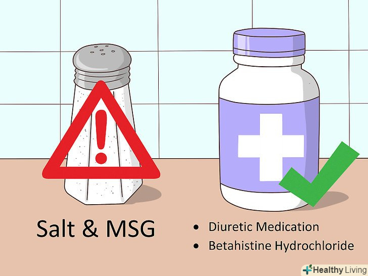 Контролюйте вміст біологічних рідин в організмі для лікування хвороби Меньєра. почніть контролювати утримання біологічних рідин, щоб послабити симптоми, а також знизити періодичність нападів вертиго, викликаних цим захворюванням внутрішнього вуха. Можна слідувати таким радам:- Обмежуйте вживання солі і продуктів з глутаматом натрію.