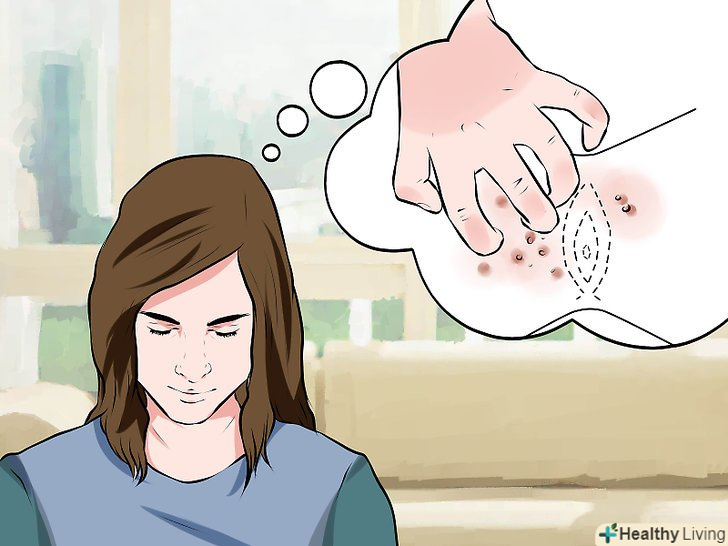 Огляньте свої статеві органи і область ануса на наявність маленьких рожевих або червоних виростів.Генітальні кондиломи з'являються у вигляді невеликих рожевих або червоних виростів на статевих органах і іноді в області ануса. Ці маленькі кондиломи можна помітити (або відчути) в піхву, на статевих губах, на шийці матки, в області ануса, на статевому члені або уретрі. Так як область ураження варіюється, в деяких випадках можна виявити кондиломи на слизовій рота, на губах, мові або на слизовій глотки.[3]- Кондиломи зовні схожі на верхівки цвітної капусти, вони можуть бути дуже маленькими і важкорозрізними. Пошукайте групи бородавок (по 3-4 штуки), які ростуть і поширюються по тілу.
