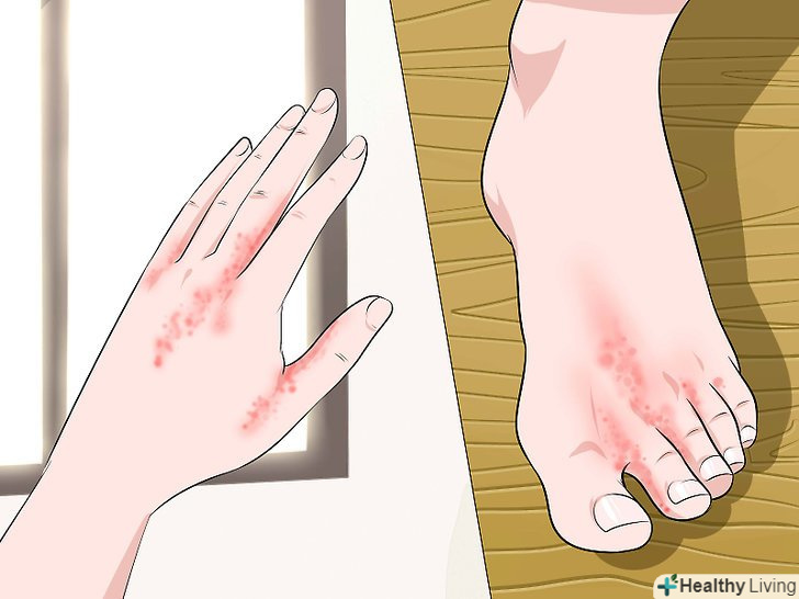 Зверніть увагу на червоні плями.грибкові інфекції можуть бути виявлені в області паху, в сідничної складці, між грудей, в ротовій порожнині і шлунково-кишковому тракті, в області пальців рук і ніг і в пупку. Як правило, грибок розвивається в більш вологих і менш провітрюваних місцях, де більше складок, ніж в інших частинах тіла.[3]- Червоні плями можуть розростатися і виглядати як невеликі червоні прищики. Намагайтеся не чесати цю висип, інакше прищики можуть лопнути, і інфекція пошириться на інші частини тіла.