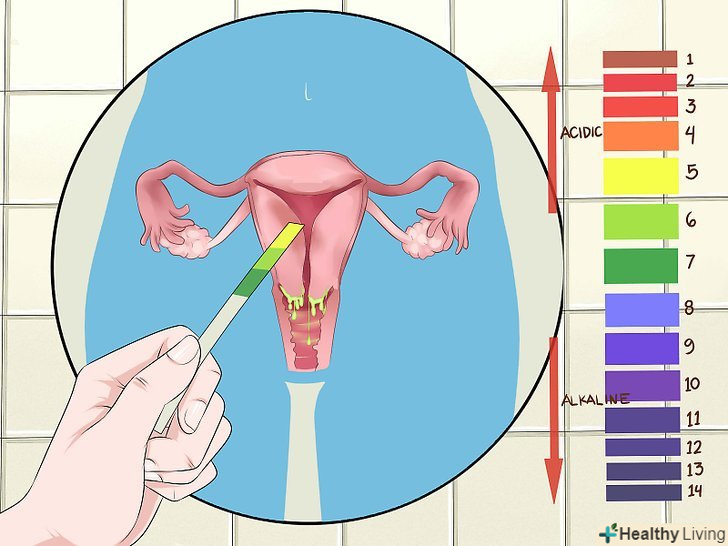 Придбайте домашній тест pH.якщо ви підозрюєте у себе наявність вагінальної грибкової інфекції (найбільш поширений тип грибкової інфекції), і вона вже була у вас раніше, то ви можете пройти тест pH і самостійно поставити діагноз в домашніх умовах. Нормальний рівень вагінального pH становить близько 4, що говорить про злегка кислому середовищі. Дотримуйтесь інструкцій тесту.[14]- Щоб провести тест, прикладіть шматочок pH-папірці до стінки піхви на кілька секунд. Порівняйте колір паперу з таблицею в комплекті тесту. Число в таблиці, яке відповідає кольору, найбільш близькому до кольору папірці, і буде вашим рівнем вагінального pH.
