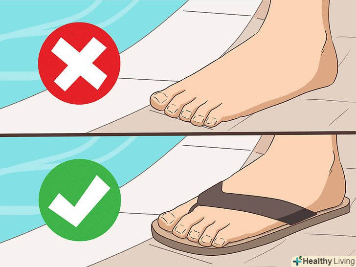 Не ходіть босоніж в громадських місцях.грибковою інфекцією можна заразитися в таких громадських місцях, як басейни і роздягальня. Одягайте сандалі перед прийомом душу, щоб запобігти зараженню дерматомікозом стопи або іншою грибковою інфекцією.