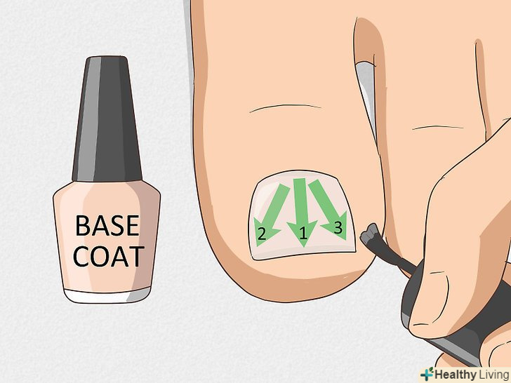 Нанесіть основу під лак.маленьким пензликом розподіліть основу по всьому нігтя, щоб він не покрився плямами, а лак краще пристав. Повторіть з кожним нігтем.[3]- Одним плавним мазком проведіть пензликом вниз посередині нігтя. Не намагайтеся зафарбувати одним мазком весь ніготь.