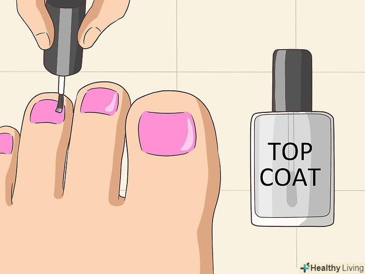 Нанесіть фініш-гель (верхнє покриття).фініш-гель захистить лак і додасть йому блиск. Нанесіть його все тим же способом. Зачекайте, поки покриття висохне, і постарайтеся не розмазати гель, поки той сохне.[6]