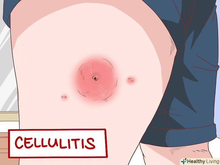 Зверніть увагу на інфекційний целюліт.МРЗС може викликати целюліт — флегмону) - гостре гнійне запалення зовнішніх шарів шкіри і лежать під ними тканин, яке нагадує швидко поширюється припухлу висип. В результаті шкіра виглядає рожевою або червоною, вона може бути гарячою на дотик, занадто чутливою або припухлої.[4]- Спочатку целюліт може мати вигляд дрібних червоних горбків. У деяких місцях шкіри він може нагадувати синці.[5]