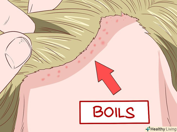 Перевірте, чи немає фурункулів.в результаті інфекції волосяних фолікулів утворюються наповнені гноєм фурункули. Огляньте шкіру голови. Перевірте також інші покриті волоссям ділянки, такі як пах, шия і пахви.[8]