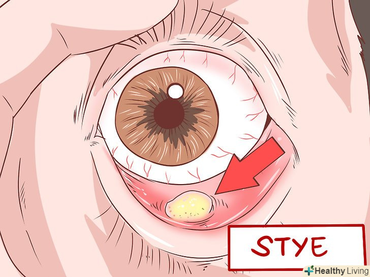 Зверніть увагу на ячмінь на оці. Ячмінь являє собою інфекцію сальних залоз століття. Він викликає запалення і почервоніння ока і століття. Ячмінь може бути внутрішнім або зовнішнім. При цьому утворюється пухлина, яка зазвичай має білуватий або жовтуватий колір і нагадує вугор.[11] ви можете відчувати біль при морганні.