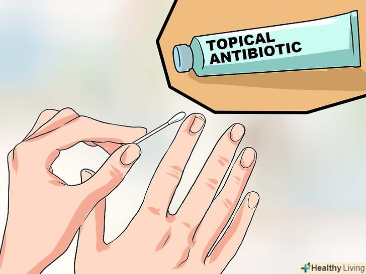 Нанесіть мазь з антибіотиком.нанесіть на палець трохи мазі з антибіотиком місцевої дії, щоб не занести інфекцію. Розмажте мазь по всьому пальцю ватною паличкою, а потім забинтуйте його.[2]- Міняйте пов'язку кожен день і не забувайте наносити мазь.