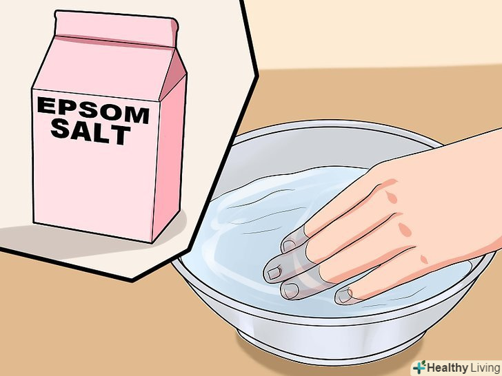 Додайте англійську сіль.врослий ніготь на пальці руки можна замочити у воді з англійською сіллю. Заповніть миску теплою водою і додайте пару столових ложок англійської солі на літр води. Замочіть руку на 15-20 хвилин.[5]- Англійська сіль допоможе вгамувати біль і зніме запалення.[6]
