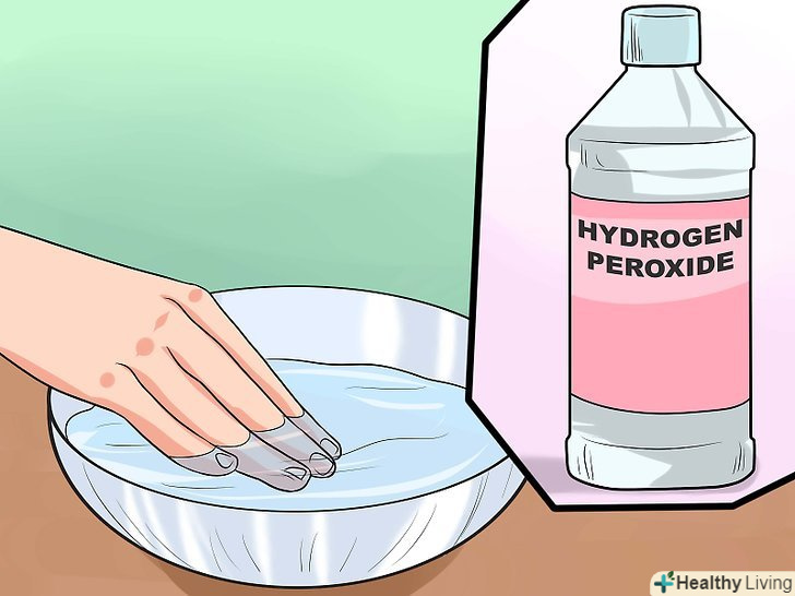 Замочуйте палець в розчині перекису водню.[7] перекис використовують, щоб запобігти потраплянню інфекції. Замочіть врослий ніготь на пальці руки в розчині теплої води і перекису. Для цього вилийте півсклянки перекису в миску з теплою водою.[8]- Замочіть палець на 15-20 хвилин.