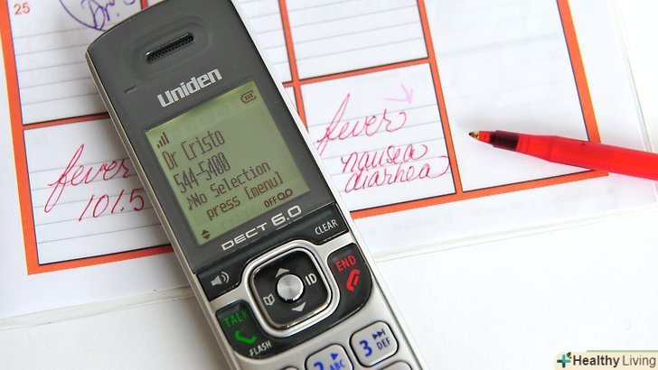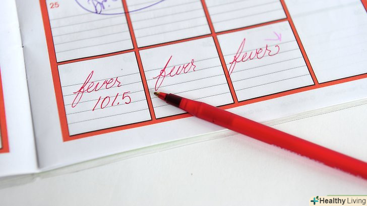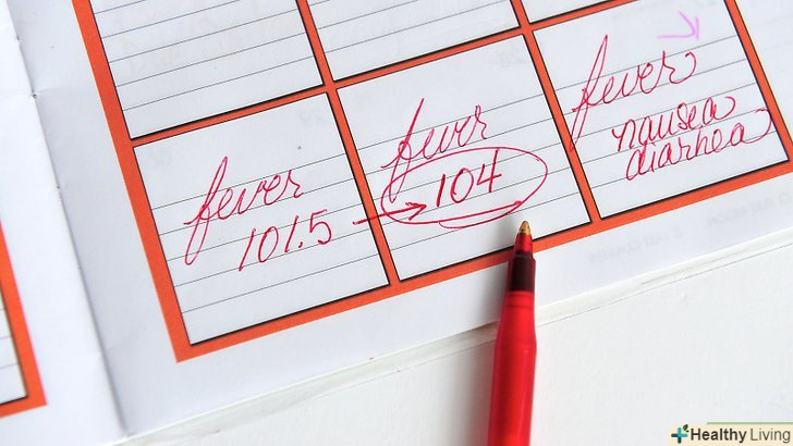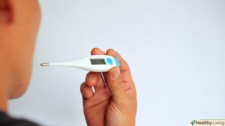 Перевірте температуру.після підбору термометра необхідно виміряти температуру (орально, в вусі, на скроневій артерії, ректально, в пахвовій западині). якщо у дорослого температура вище 39°C,[33] у дитини старше 3 місяців температура вище 39°C, у новонародженого (0-3 місяців) температура вище 38°C, негайно викличте лікаря.[34]- Вимірювання температури ректально у дитини.ректальний спосіб вимірювання температури є найбільш точним у дітей, проте необхідно бути обережним, щоб не проткнути стінку кишечника у дитини. Для ректального вимірювання температури підійде електронний термометр.