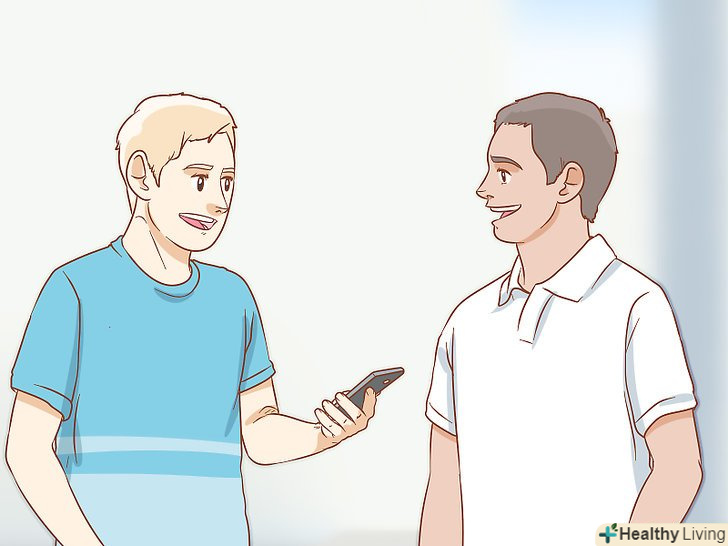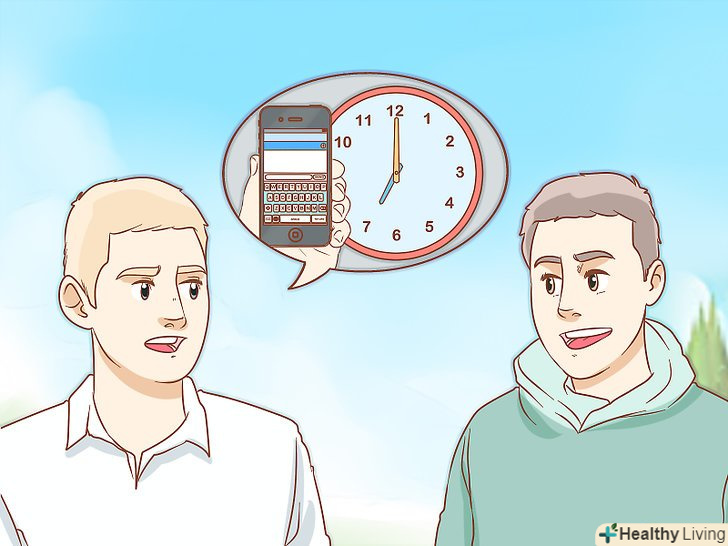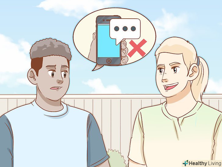 Розкажіть іншим про свою проблему.підтримка інших людей-це важлива складова психічного здоров'я.[18] позитивні взаємодії з людьми створюють відчуття захищеності і тісного зв'язку. Ці елементи дуже важливі, якщо вам потрібно побороти залежність від телефону, оскільки використання телефону хоча б частково пов'язано з соціальною активністю (листування, додатки соціальних мереж). Не сперечаємося, мобільний телефон викликає позитивні почуття, в той же час він обмежує нас і позбавляє більш близьких зв'язків.- Скажіть родичам і друзям, що, на вашу думку, Ви користуєтеся телефоном занадто часто і плануєте скоротити кількість часу, який ви на нього витрачаєте. Крім того, можна попросити їх про щось конкретне, якщо ви хочете, щоб вони допомогли вам. Наприклад, попросіть їх дзвонити і писати вам тільки в певний час.