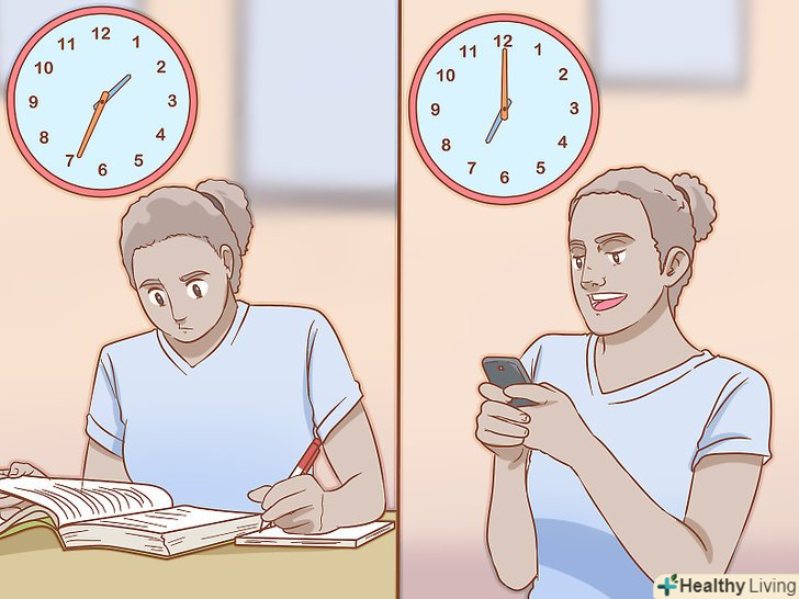 Складіть план.обмежте використання телефону лише певними часовими відрізками. Встановіть нагадування на телефоні, яке повідомляло б вам, що ви досягли максимуму. Наприклад, можна дозволити собі використовувати телефон тільки з 6 до 7 години вечора. Можна вибрати тимчасові відрізки, коли ви не будете користуватися телефоном взагалі (припустимо, коли ви на роботі або на навчанні).[4]- Запишіть свої цілі та план, щоб вони були більш конкретними. Час від часу повертайтеся до списку цілей, щоб бачити, яких ви вже досягли, А які ще попереду.