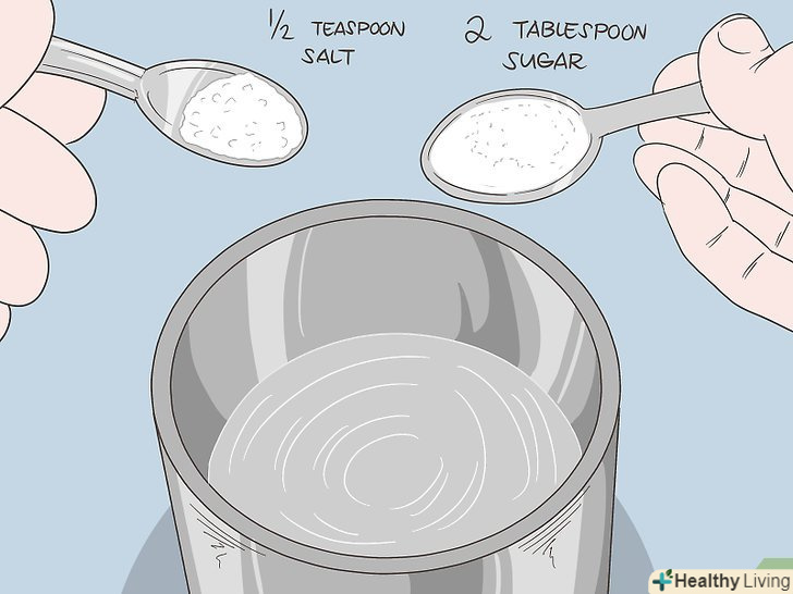 Змішайте сухі інгредієнти.насипте половину чайної ложки солі і 2 столові ложки цукру в чисту ємність. Ви можете використовувати гранульований або порошкоподібний цукор.- Якщо у вас немає чайної ложки для вимірювання, ви можете використовувати жменю цукру і дрібку солі. Однак використовуйте цей метод тільки в крайньому випадку, оскільки ваші вимірювання будуть неточними.[3]