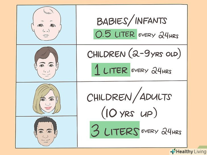 - Діти (старше 10 років) і дорослі: 3 літри ОРС кожні 24 години